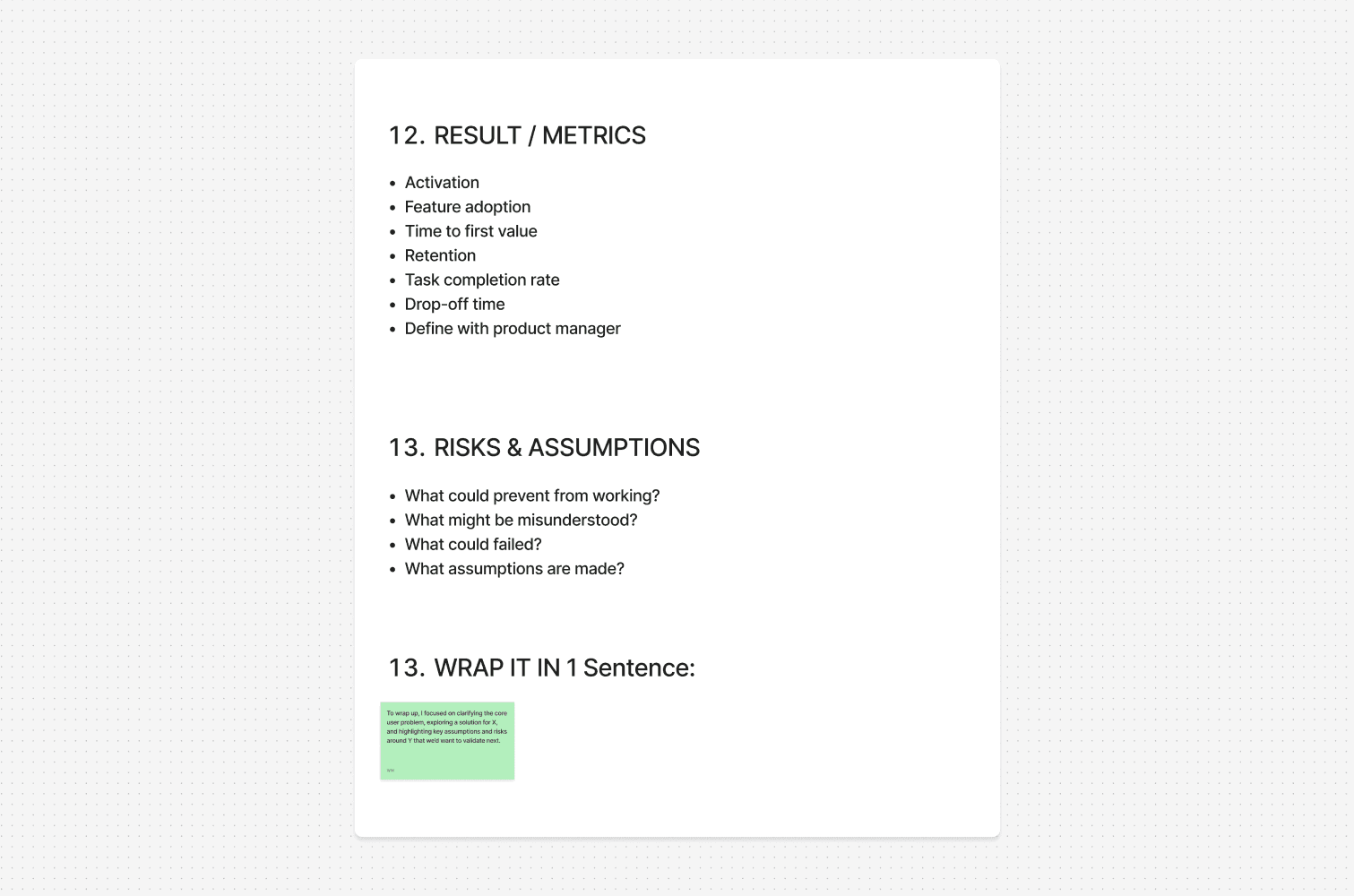 I cover metrics, risks, assumptions, validation, and how this would continue in a real team.