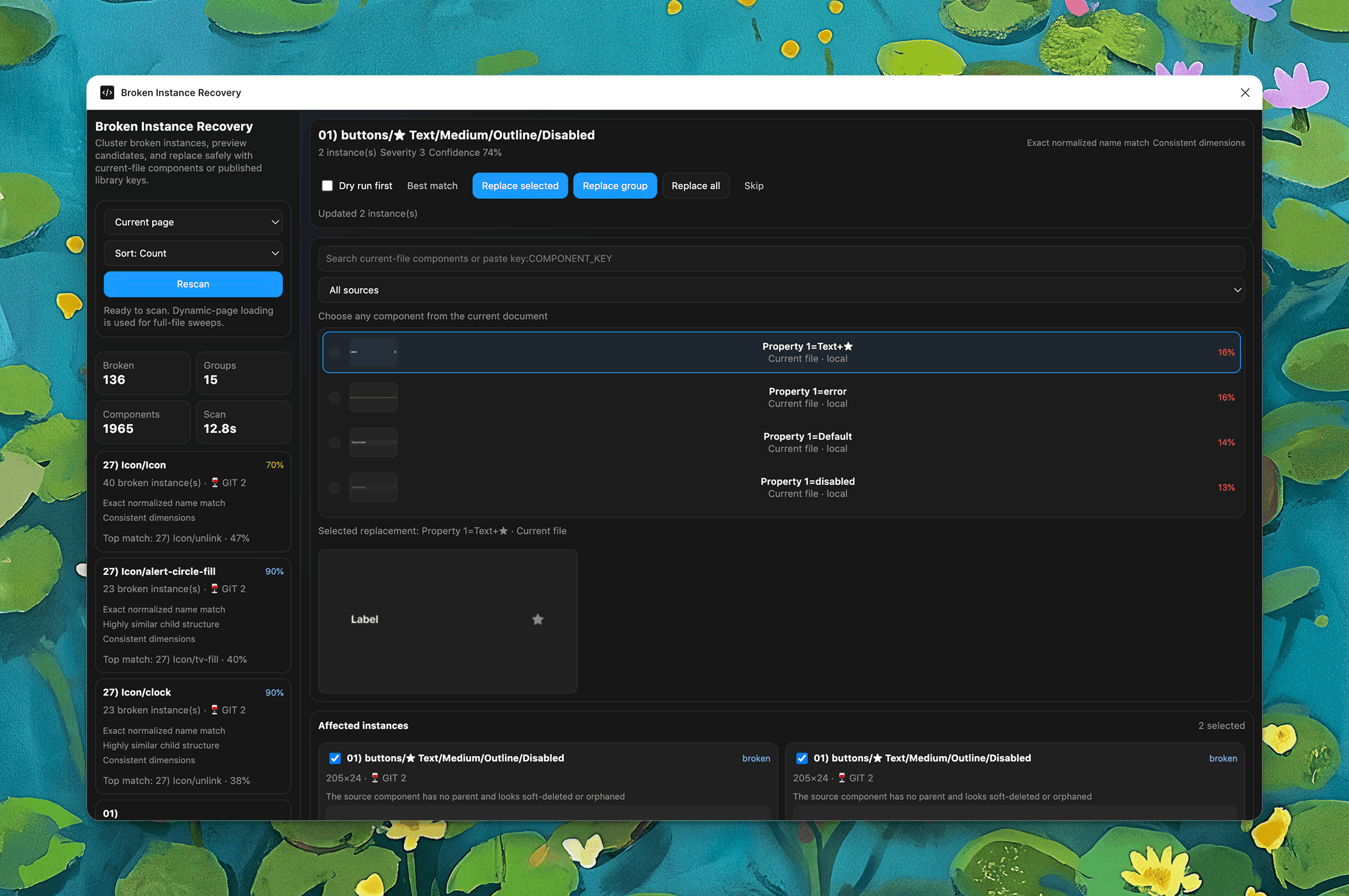 I built a plugin that scans the entire file, specific pages, or just a selection, identifies these broken instances, and groups them in a way that’s easy to review. But more importantly, it doesn’t just detect problems - it enables you to fix them at scale.
